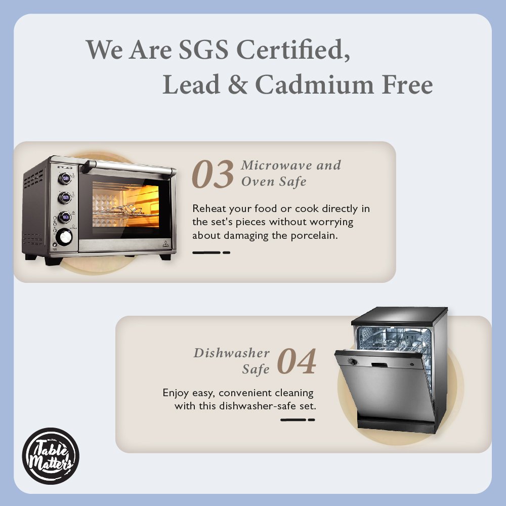 Our tableware are Lead and Cadmium Free. Microwave Safe. Oven Safe and Dishwasher Safe