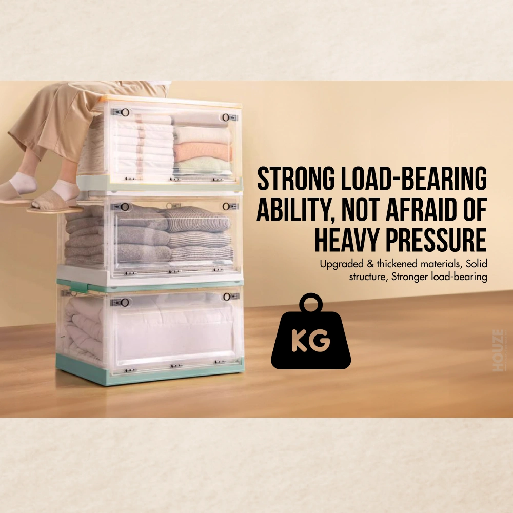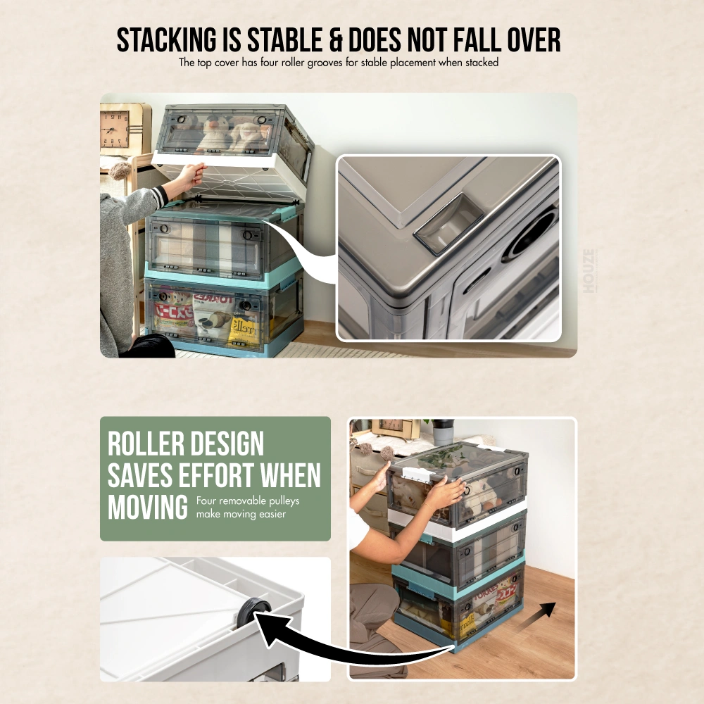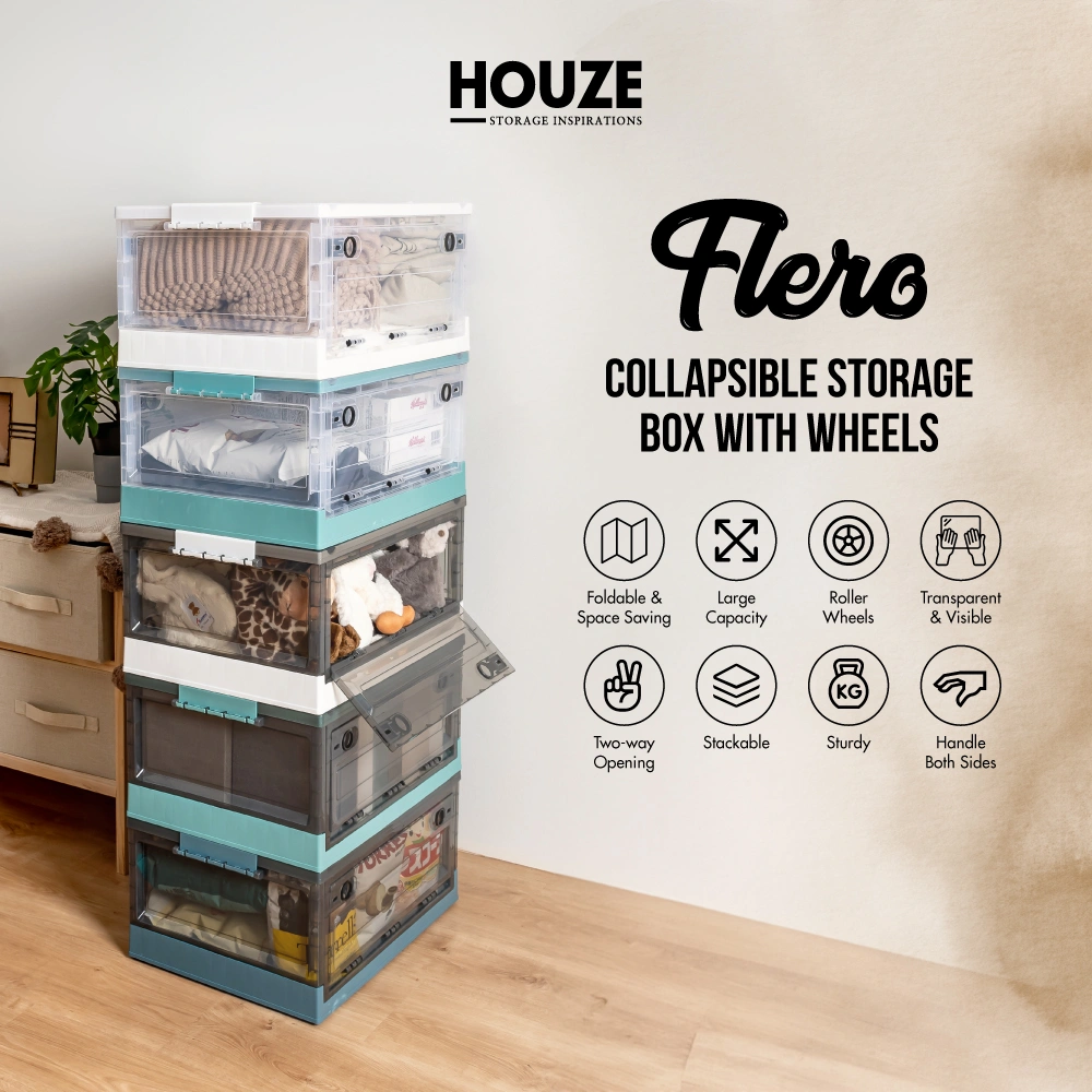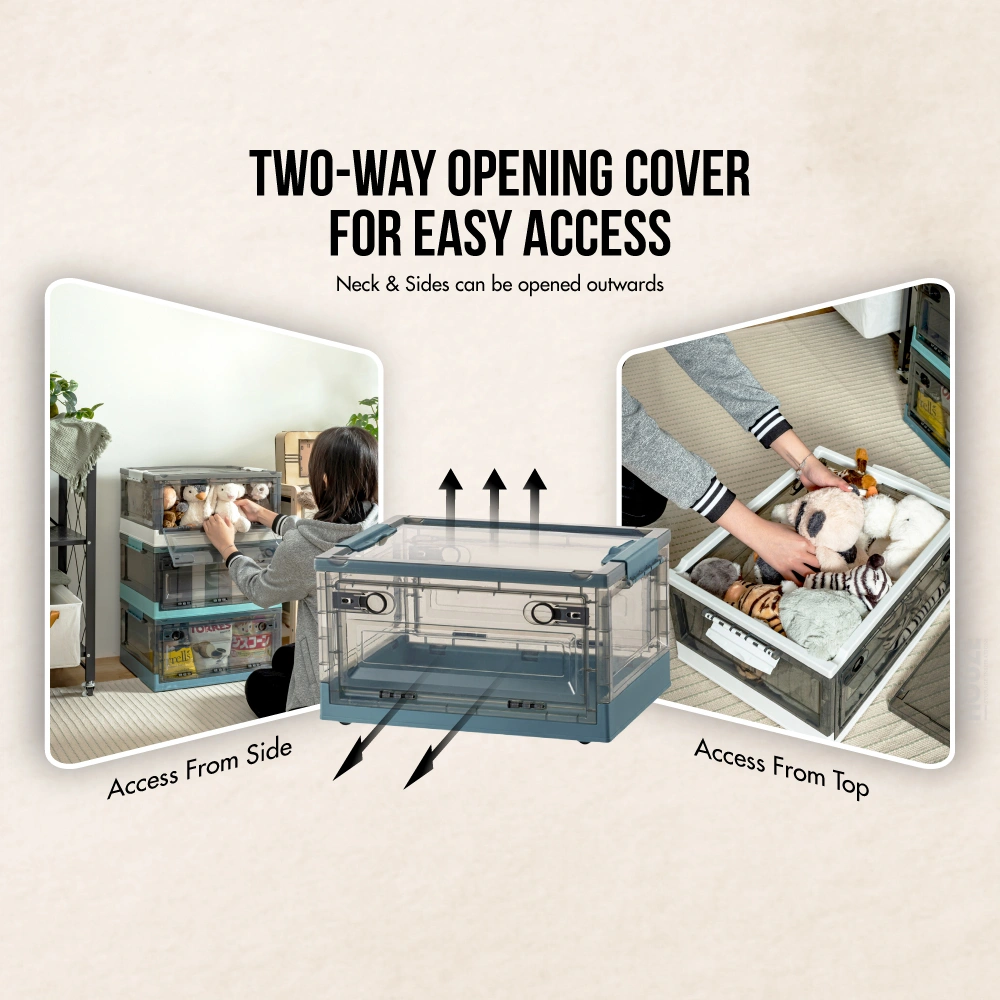 Introducing the game-changer in storage solutions: the HOUZE – ‘FLERO’ Collapsible 55L Storage Box with Wheels (Smoke Grey & Blue). Meticulously designed from top-grade Virgin PP material. ‘FLERO’ promises unmatched durability and style. With its visionary side-opening access and smooth-rolling wheels. this box is the future of accessible. visible. and mobile storage. Thanks to its crystal-clear design. a glance and your items are within reach. Redefine organisation and accessibility with ‘FLERO’.