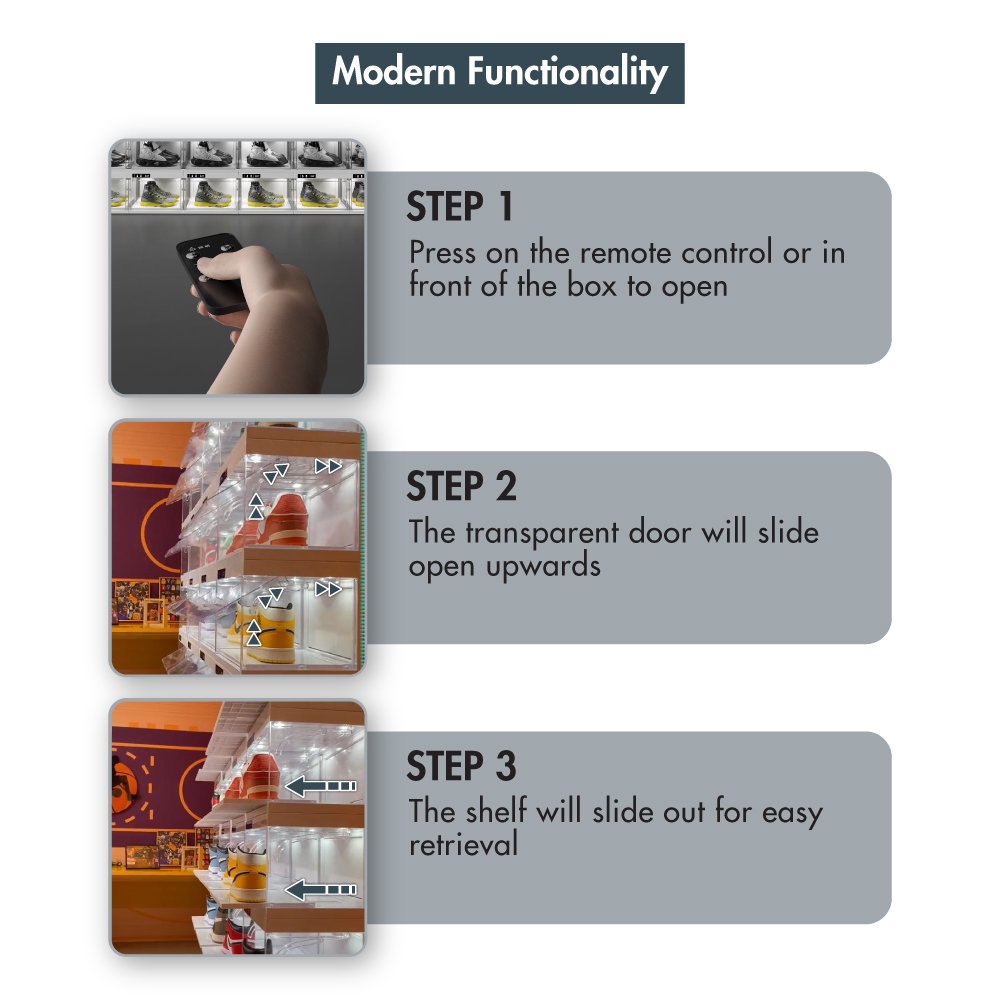 Here’s where form meets function. The SoleMate IllumiCube is brilliantly designed to stack effortlessly. Each box connects automatically with the one above. creating a secure and visually striking tower. And with its transparent lid and pull-out drawer mechanic. accessing and admiring your collection has never been this easy.